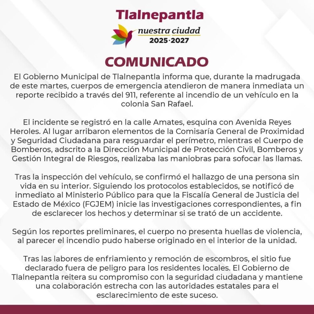 Luego de controlar el siniestro y llevar a cabo la inspección del automóvil, las autoridades confirmaron el hallazgo de una persona sin vida en el interior de la unidad. Conforme a los protocolos correspondientes, se dio aviso al Ministerio Público, por lo que la Fiscalía General de Justicia del Estado de México (FGJEM) inició las investigaciones para esclarecer los hechos.