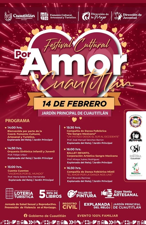 El Gobierno Municipal de Cuautitlán, encabezado por la presidenta municipal Juanita Carrillo, invita a la comunidad al Festival Cultural “Por Amor a Cuautitlán”, que se llevará a cabo el viernes 14 de febrero en el Jardín Principal a partir de las 14:00 horas.