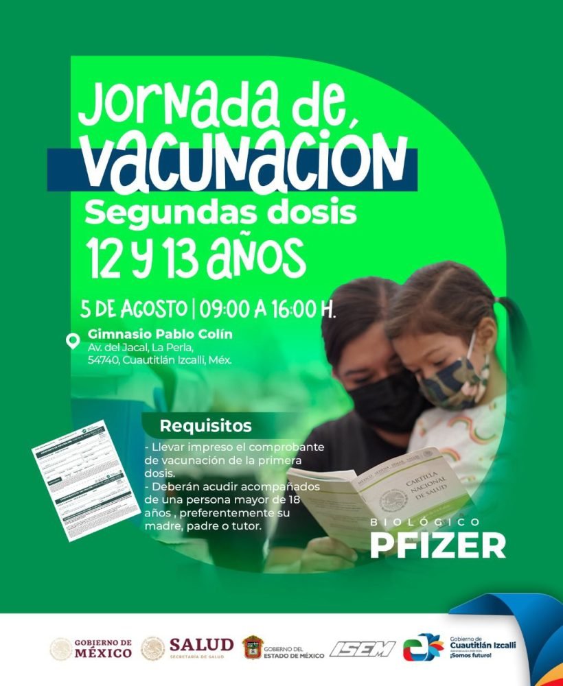El Gobierno de Cuautitlán Izcalli que preside Karla Fiesco García, informa que el día 05 de agosto, se llevará a cabo la aplicación de la segunda dosis del biológico Pfizer como parte de la Jornada Nacional de Vacunación contra COVID-19 para los niños de 12 y 13 años en el Gimnasio Pablo Colín en un horario de las 9:00 a las 16:00 horas.