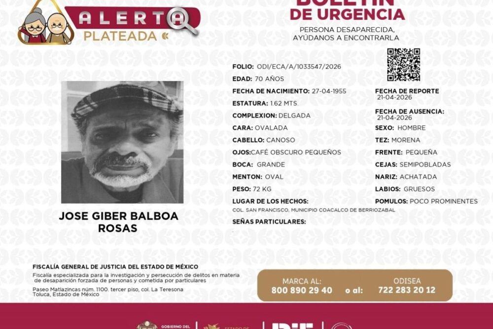 Autoridades del Estado de México y familiares reportaron la desaparición de José Giber Balboa Rosas, de 71 años, luego de que fue visto por última vez en las inmediaciones de una estación del Mexibús en el municipio de Coacalco.