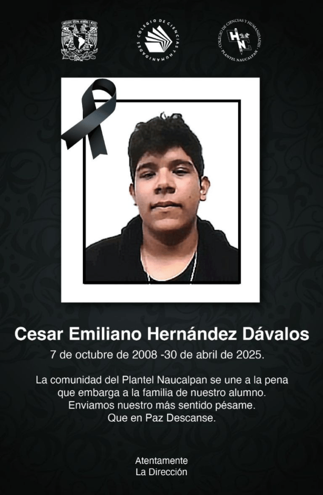 En redes sociales circula un video que muestra los instantes previos al desvanecimiento de César Emiliano Hernández Dávalos, alumno del Colegio de Ciencias y Humanidades (CCH) plantel Naucalpan, quien perdió la vida tras colapsar durante un evento musical realizado dentro de la institución, la cual forma parte de la Universidad Nacional Autónoma de México (UNAM).