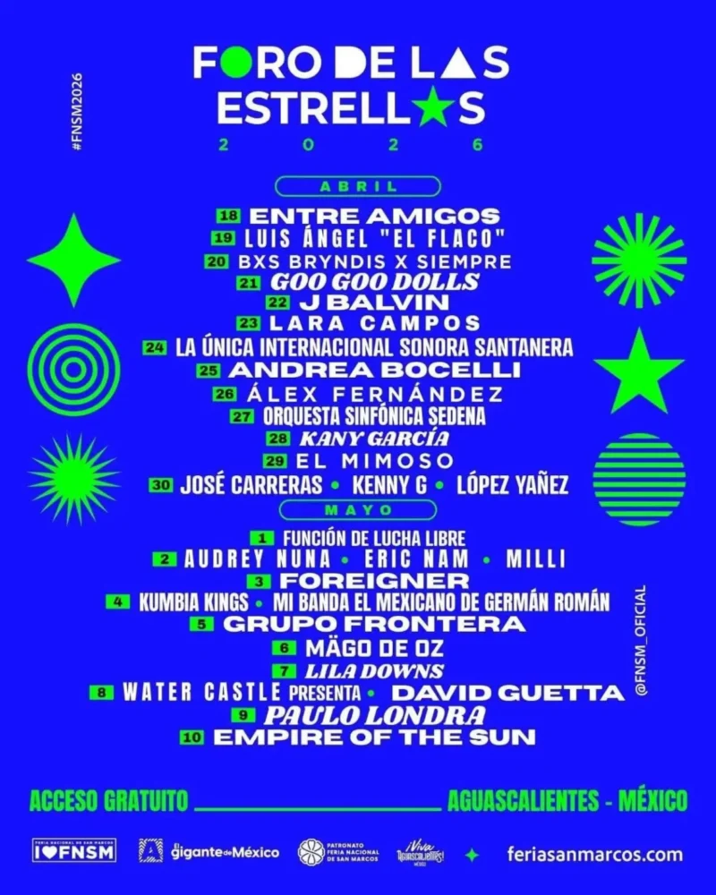 La Feria Nacional de San Marcos 2026 se celebrará del 18 de abril al 10 de mayo de 2026 en la ciudad de Aguascalientes, México. El evento contempla un programa que integra espectáculos musicales, exposiciones ganaderas, actividades culturales, juegos mecánicos y espacios comerciales.
