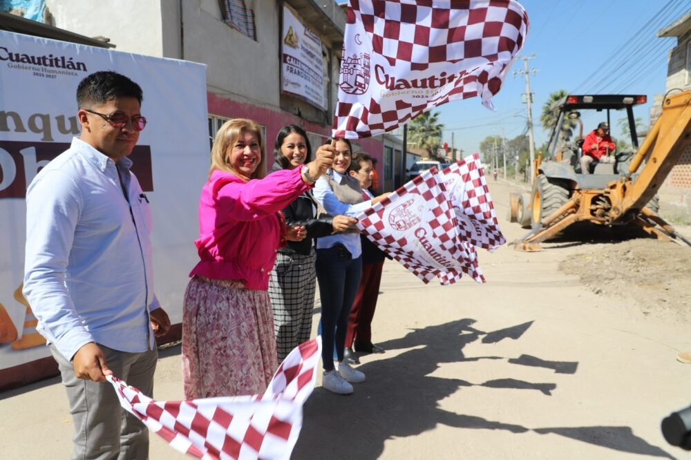 La presidenta municipal de Cuautitlán, Juanita Carrillo, entregó la pavimentación con concreto asfáltico de la calle Fracción Santiago y dio el banderazo de inicio a las obras de pavimentación con concreto hidráulico en las calles Francisco Sarabia, Pascual Morlán y la Segunda Cerrada de Teyahualco, en la comunidad de Tlaxculpas.