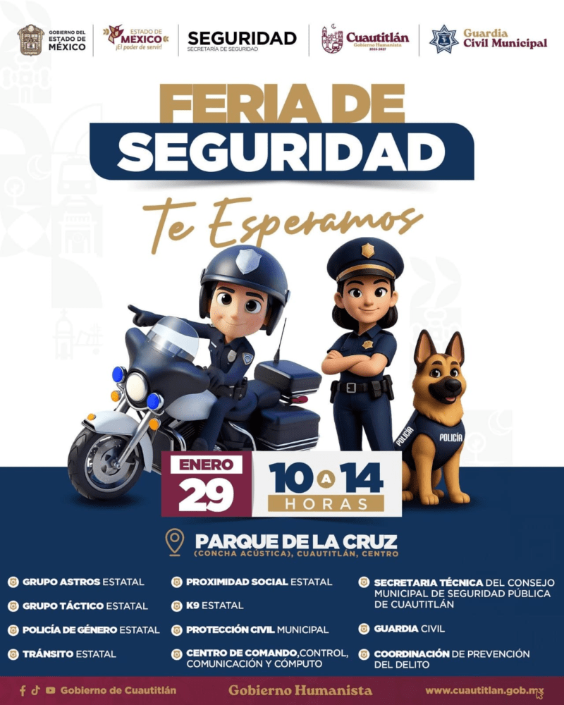 La Feria de Seguridad se realizará el jueves 29 de enero de 2026, a partir de las 10:00 horas, en el Parque de la Cruz (Concha Acústica), ubicado en la calle Enrico Martínez número 210, colonia El Huerto, en la zona centro del municipio.