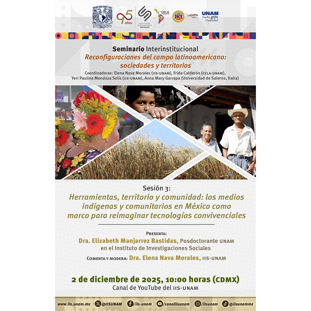 El Instituto de Investigaciones Sociales (IIS) de la UNAM inició la tercera sesión de su Seminario Interinstitucional bajo el título “Herramientas, territorio y comunidad: los medios indígenas y comunitarios en México como marco para reimaginar tecnologías convivenciales”. La sesión se llevó a cabo este martes 2 de diciembre en modalidad de transmisión virtual, congregando a especialistas y académicos.