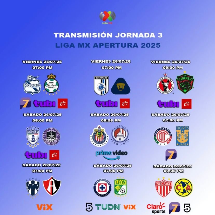 La Jornada 3 del Torneo Apertura 2025 de la Liga MX se disputará los días 25 y 26 de julio, con nueve partidos programados en distintos estadios de México. Esta fecha marcará el cierre de actividades antes de la pausa por la Leagues Cup 2025, torneo que enfrentará a clubes de la Liga MX y la MLS. A continuación, se detallan los encuentros, horarios y canales de transmisión.