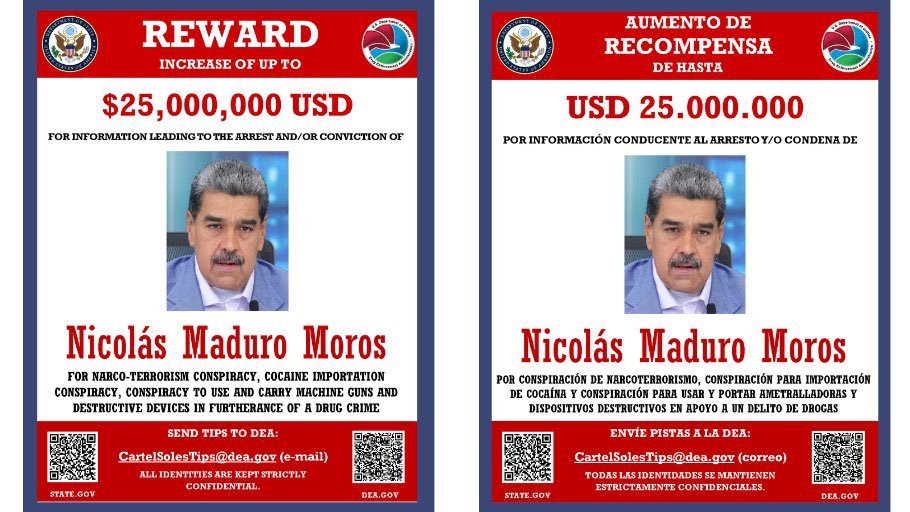 La Administración de Control de Drogas de Estados Unidos (DEA, por sus siglas en inglés) mantiene activa una oferta de recompensa de 25 millones de dólares por información que conduzca a la captura o condena de Nicolás Maduro.