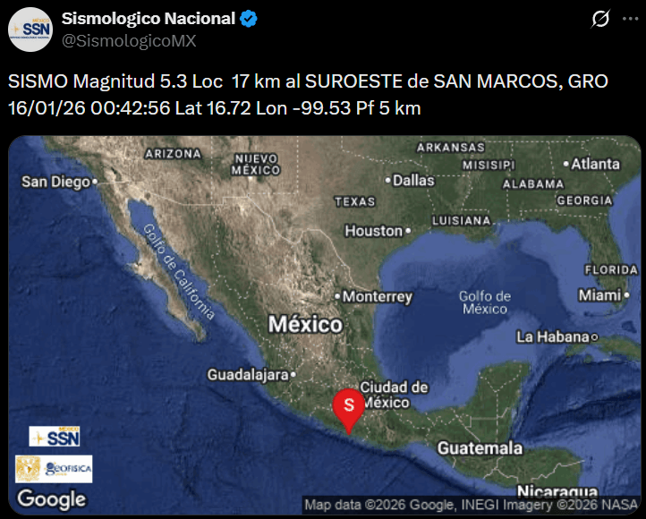 La madrugada de este viernes 16 de enero de 2026 se activó la alerta sísmica en la Ciudad de México, luego de que se registrara un sismo con epicentro en el municipio de San Marcos, en el estado de Guerrero.