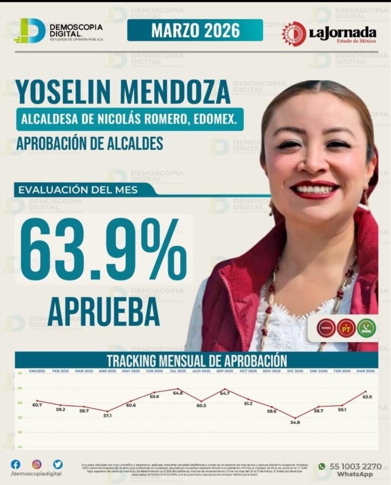 El estudio, elaborado por la consultora Demoscopia Digital durante el mes de marzo, le otorga una aprobación ciudadana del 63.9 por ciento, indicador que refleja la percepción positiva de la población respecto a su gestión al frente del municipio.